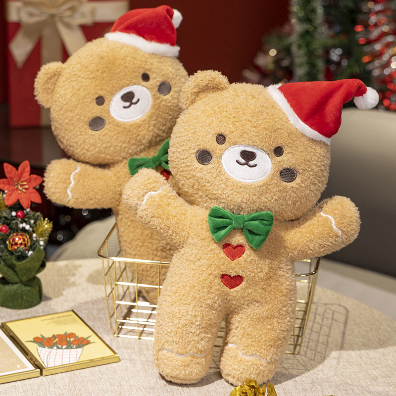 Ginger Christmas Bear duo is the epitome of holiday warmth and joy. These two plush teddy bears are crafted with a soft, ginger-hued fabric that evokes the comforting essence of holiday treats. Each bear dons a festive Santa hat, adding a classic touch to their endearing appearance. One bear features a charming green bow tie adorned with a heart, while the other boasts a sweet row of heart-shaped buttons, symbolizing the love and warmth of the season.