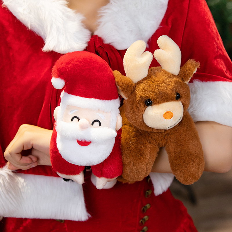 Santa, with his rosy cheeks and merry smile, is dressed in his iconic red suit and hat, both crafted from soft, plush fabric that begs to be touched. Accompanying him is a plush reindeer, complete with its own set of cozy antlers, an adorable face, and a warm, brown coat. The reindeer’s friendly eyes and soft nose complete its endearing look.