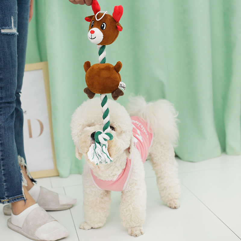 Celebrate the season of giving with our “Jolly Pup’s Playtime” Christmas Cotton Rope Pet Toy! This festive and durable toy is designed to bring joy to your furry friend during the holiday season. Featuring an adorable Santa and reindeer, connected by a strong, multi-colored cotton rope, this toy is perfect for games of tug-of-war or for solo playtime.