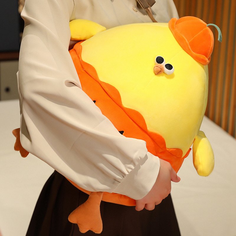 These adorable, oversized plush toys are a delightful blend of a chick’s cuteness and the festive spirit of a jack-o’-lantern. Crafted with attention to detail, each plushie features a bright orange pumpkin body, a cheeky chick face, and a little green stalk atop their heads, evoking the playful essence of a harvest festival.