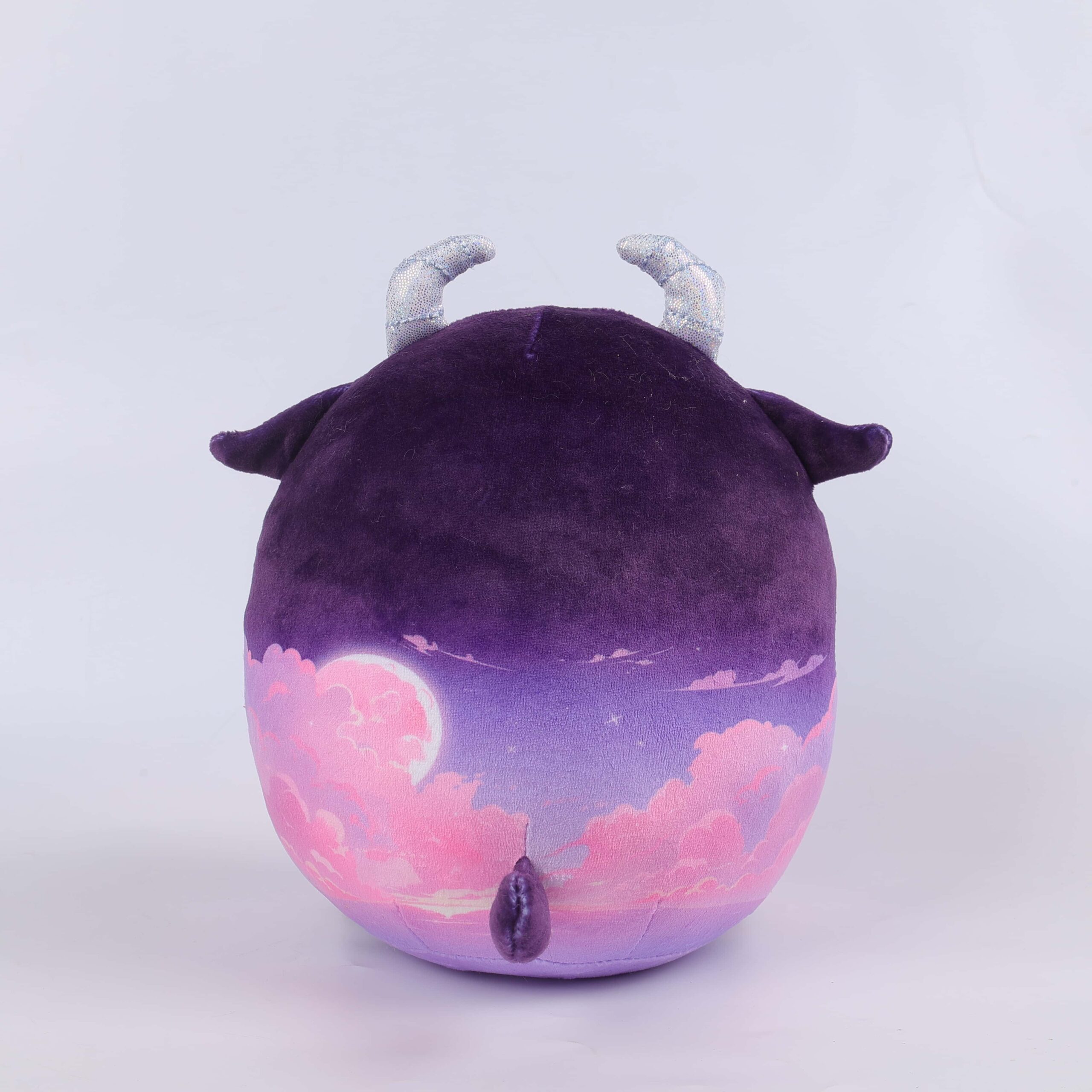 This charming plush toy captivates with its deep purple hues, simulating the velvety darkness of the nocturnal hours, gradually transitioning into a soft pink and blue reminiscent of a serene sunset. Adorned with sparkling silver horns that reflect the twinkling stars, its enchanting design is completed with a whimsical moon and cloud motif on its belly, inviting dreamy gazes and imagination.