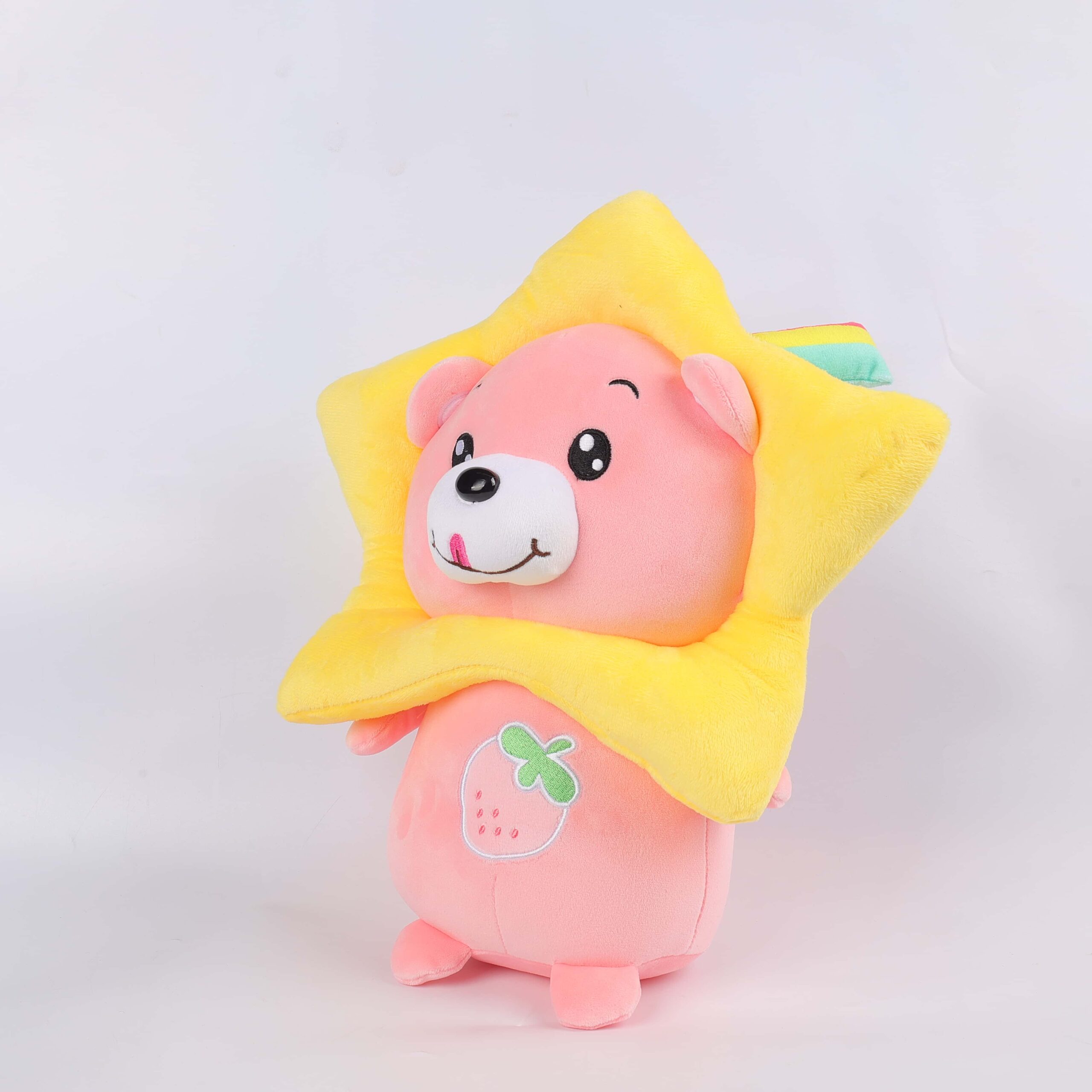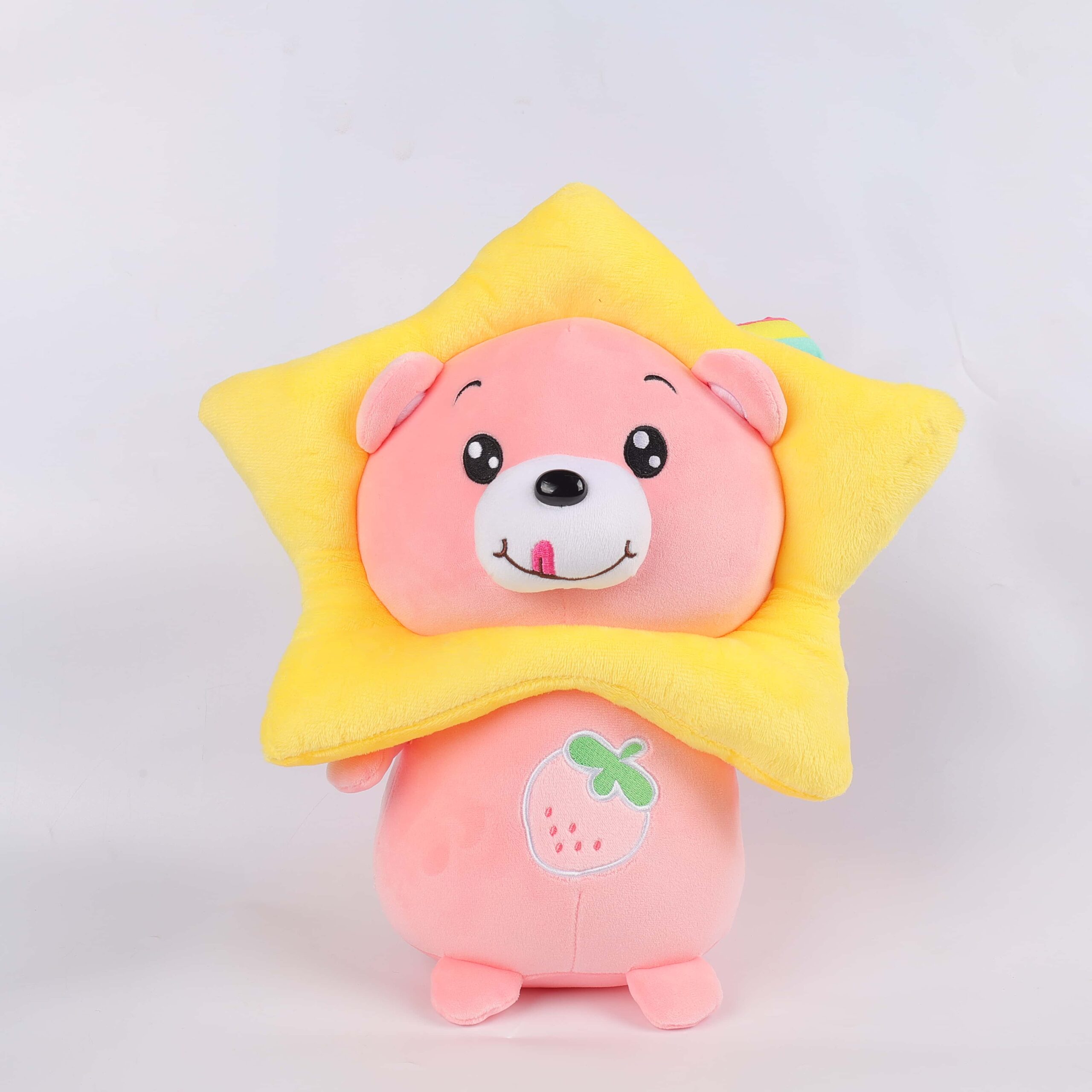 Meet “Strawberry Shine,” a plush bear that captures the essence of joy and playfulness. Decked in a radiant yellow star outfit, this plush bear is designed to spark imagination and bring smiles.