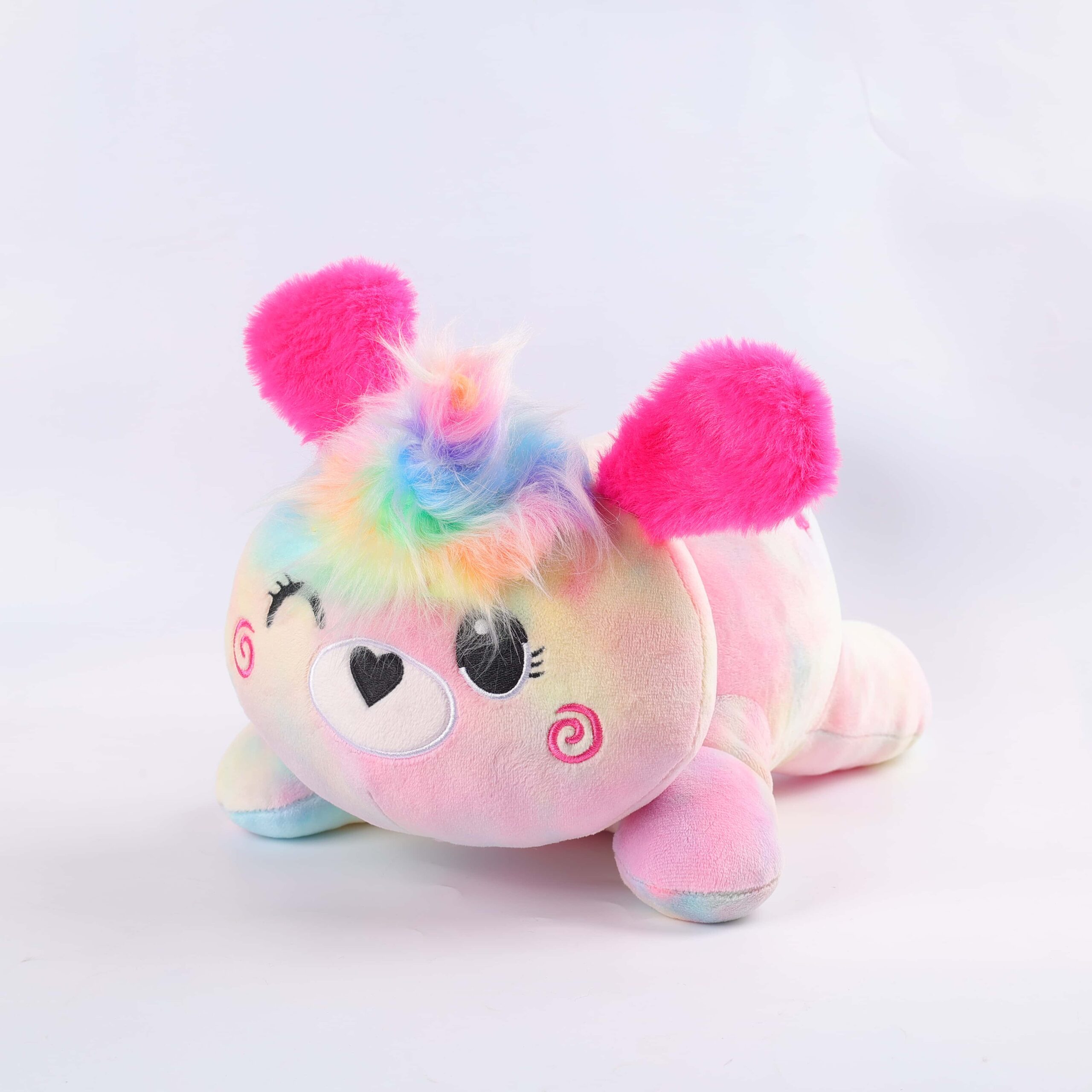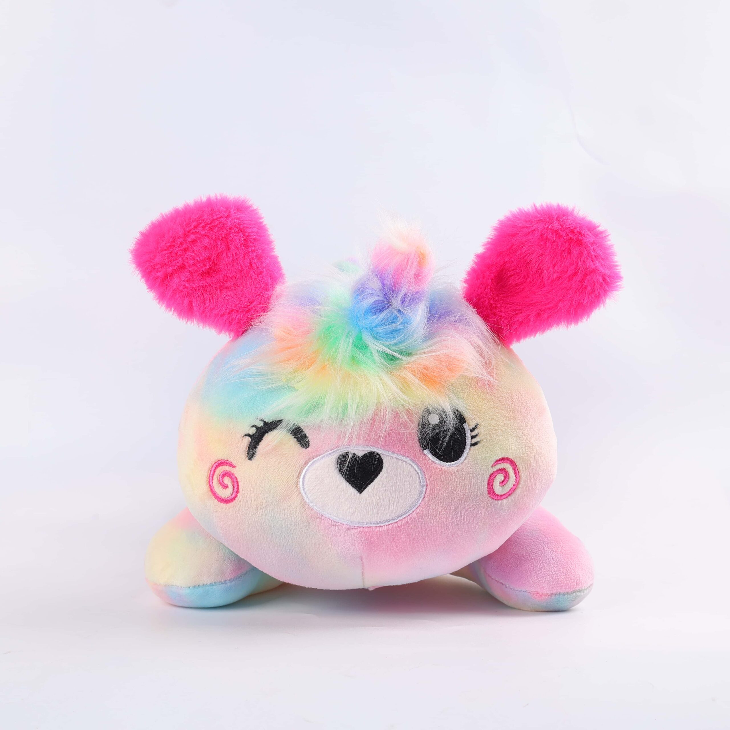 This adorable creature comes with a soft pastel-colored body that invites warm embraces and offers comfort. Its heart-shaped eyes and sweet facial features add to its charm, while the vibrant, multi-colored tuft of hair on its head is soft to the touch and visually delightful. The fluffy pink ears stand alert, adding a playful dimension to its appearance.