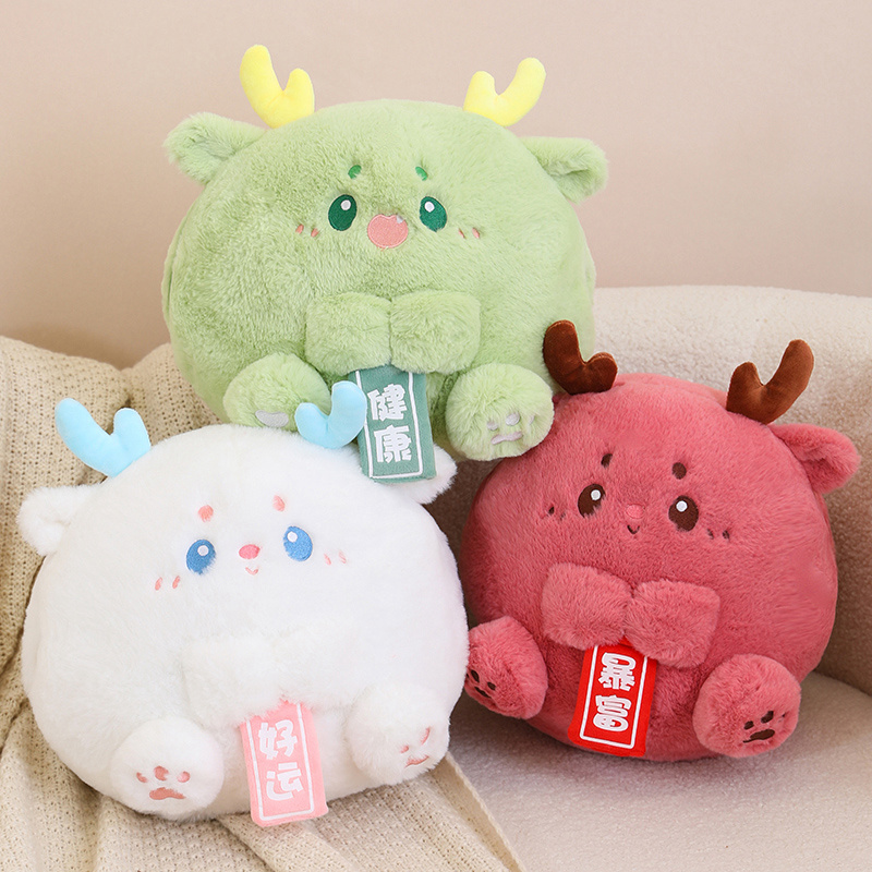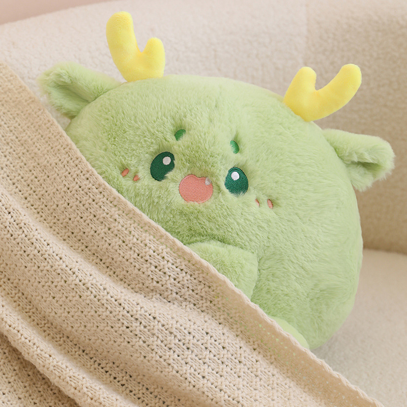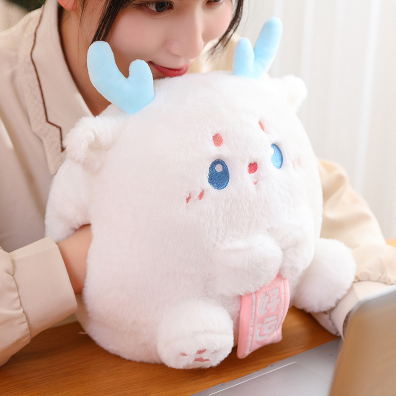 The plush toys come in a variety of vibrant colors: a fresh green with gentle yellow horns reminiscent of a young forest guardian, a deep pink creature with adorable brown antlers that speak of mystical forests, and a pure white being with sky-blue horns that seem to have stepped out of a winter fairy tale. Each one has its own unique expression, with sparkling eyes and a tender smile that invites you to share in their silent tales of mythical lands.