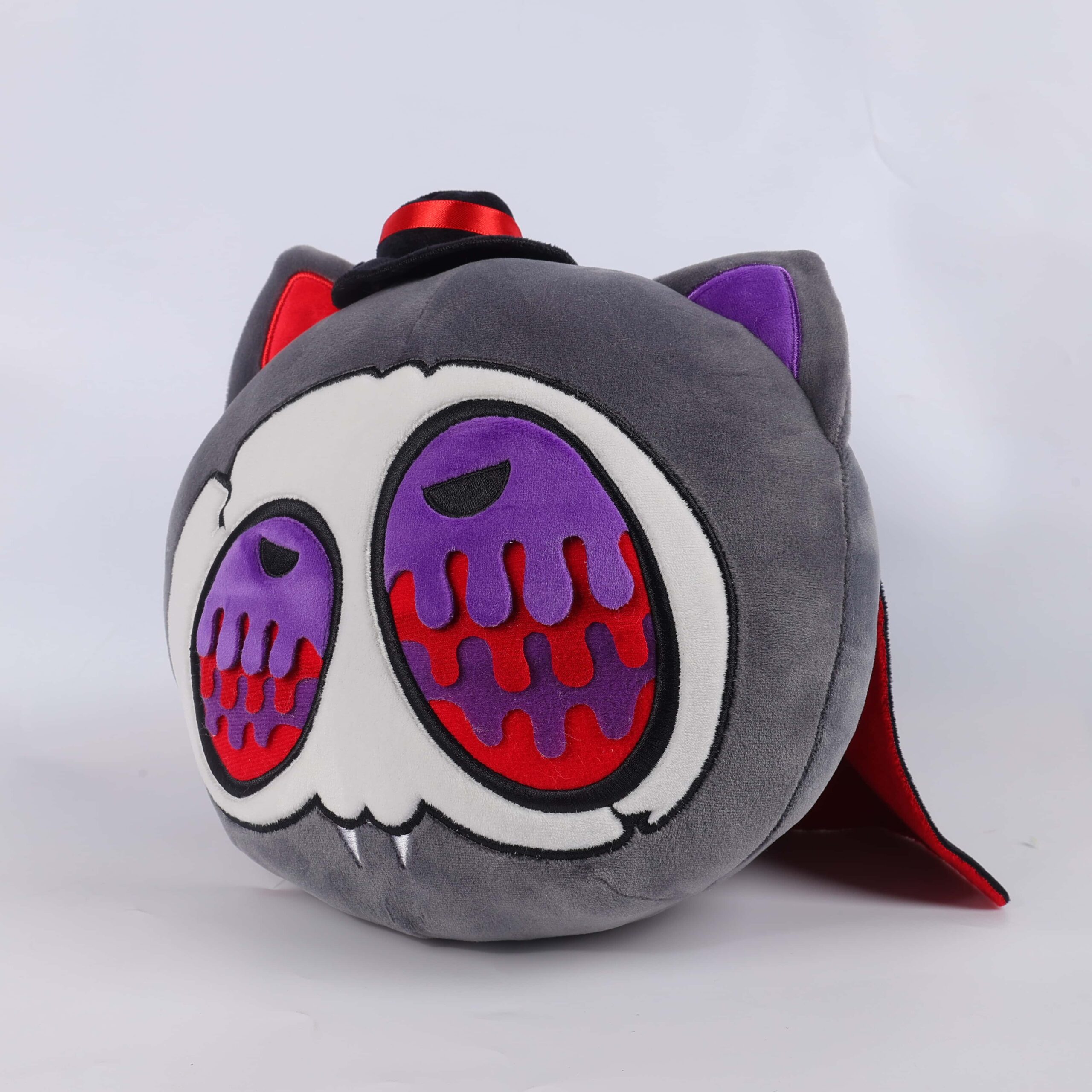 “Mystic Nocturne,” a plush toy that is a delightful fusion of spooky and cuddly. Designed with a gothic charm, this plush features a dark grey and black color scheme, with accents of deep purple and crimson for a dramatic effect.