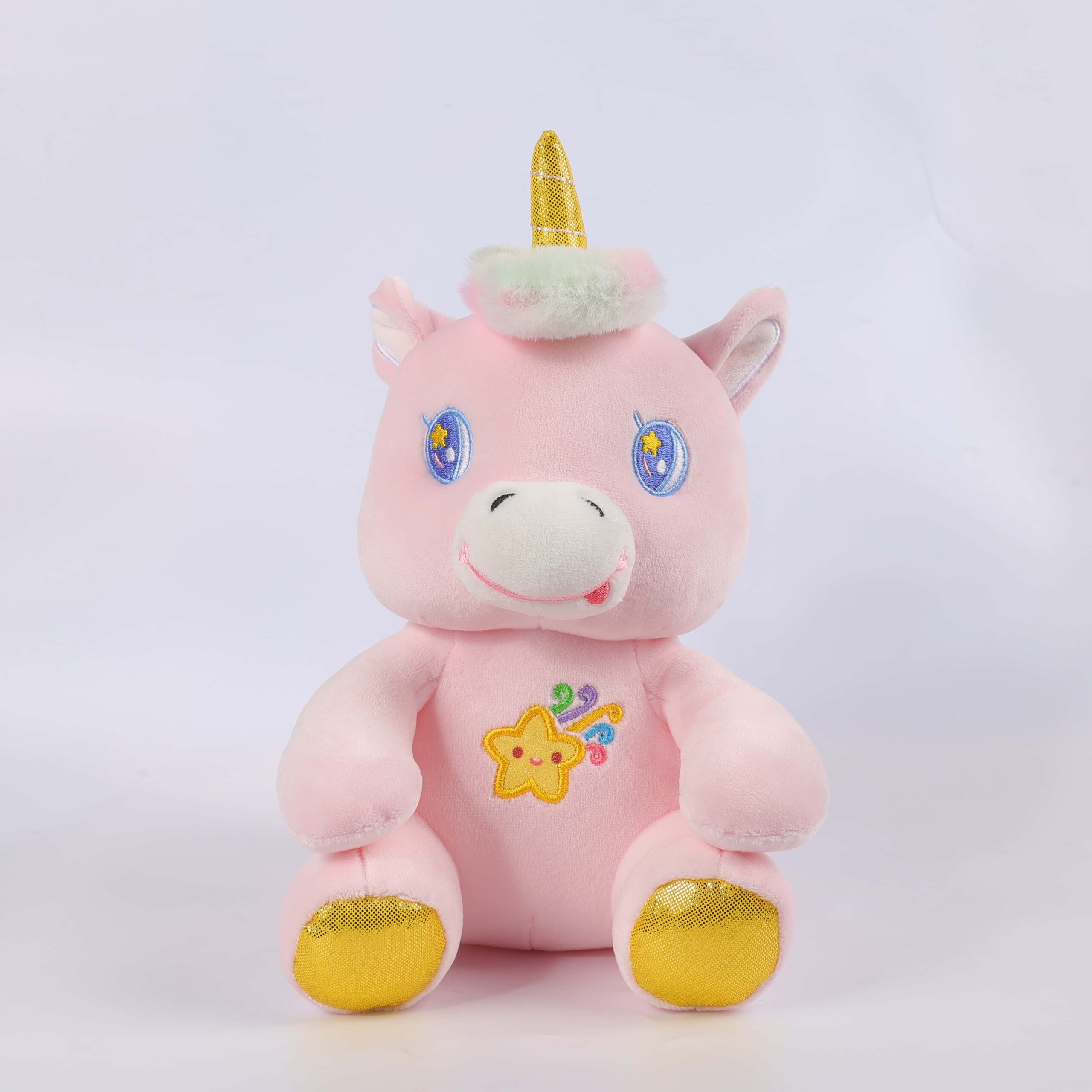 “Starlight Sparkle” is a plush unicorn toy with golden highlights and a starry belly patch, crafted for comfort and magic. It’s an adorable gift for all ages.
