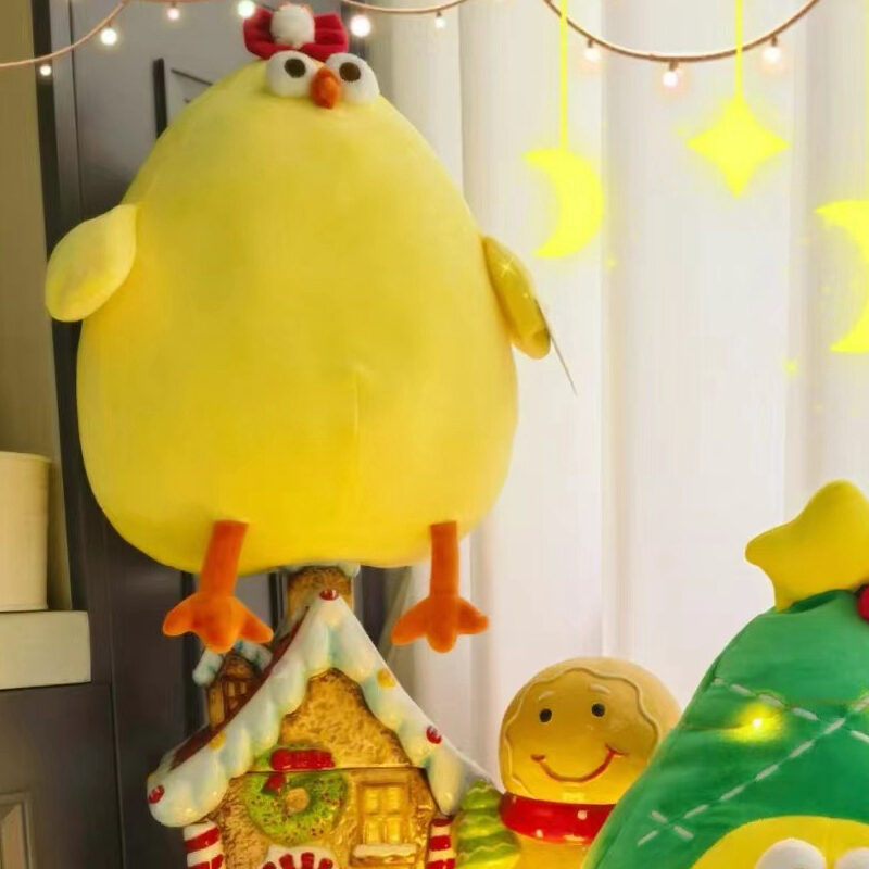 At the forefront is a plump, cheerful yellow bird, oversized and ready for hugs, topped with a tiny red Santa hat and a look of joyous surprise. Next, we have a quirky green Christmas tree, complete with ornaments and a friendly face, happily nestled beside our feathered friend. The set is completed by a merry crew of miniature companions, including a smiling gingerbread house, a dapper little chick with a cozy scarf, and whimsical mushroom stools, all under a canopy of soft, glowing moon and star lights.