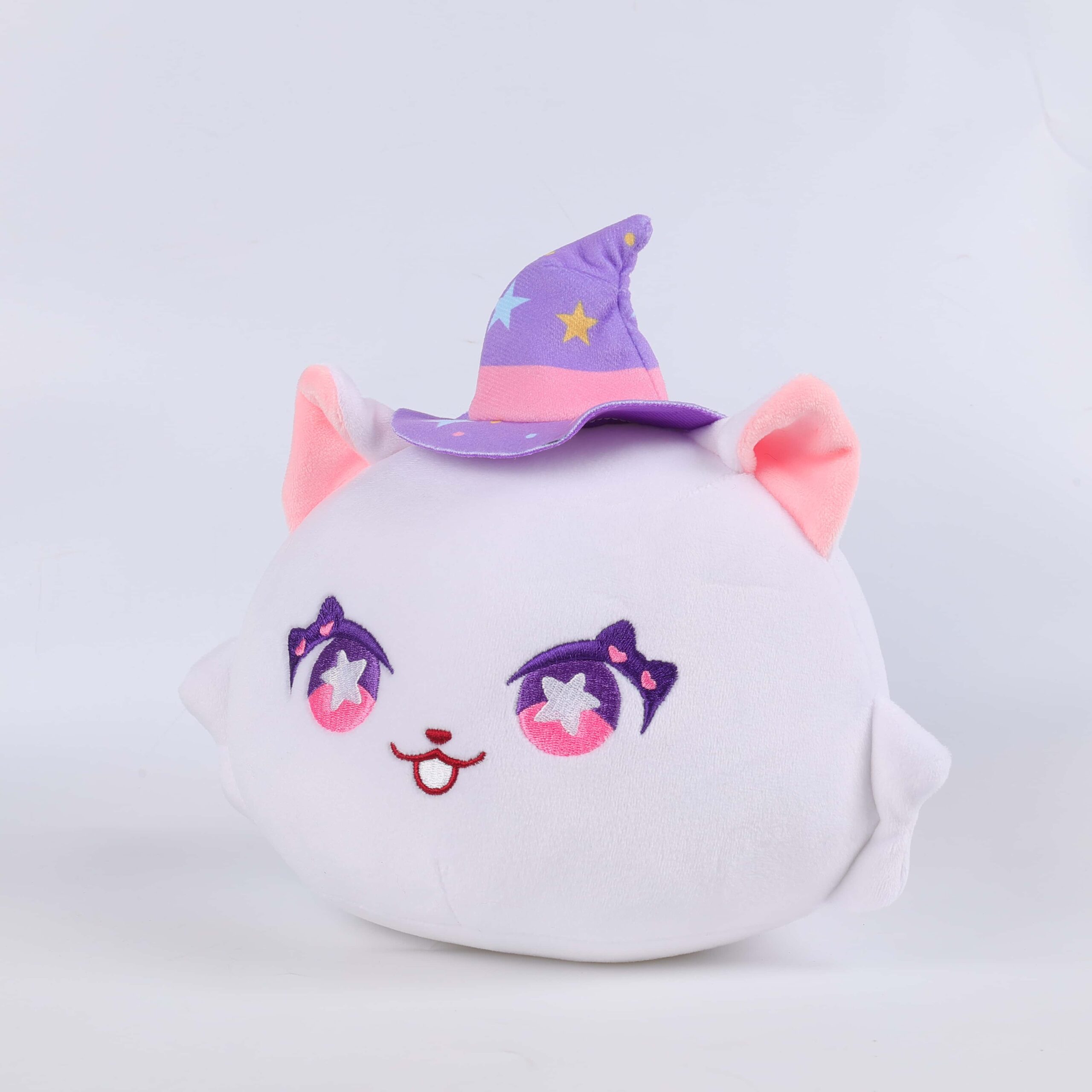 Clad in a whimsical witch’s hat adorned with stars and moons, this plush kitty is not just for Halloween but a year-round companion for magic and fun. Its soft, white fur is complemented by vibrant purple accents and twinkling starry eyes, making it a delightful addition to any plush collection.